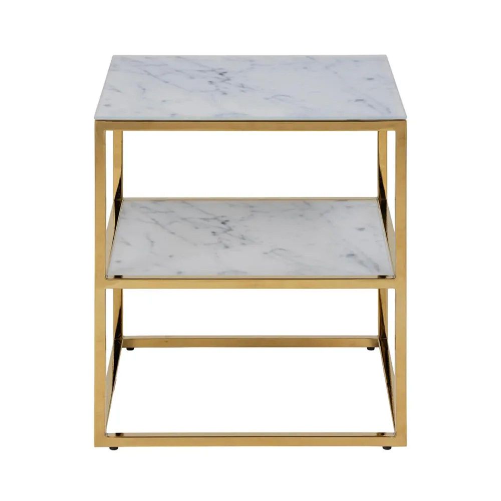 The Alisma Bedside Table is a compact side table crafted from Marble, Steel and Glass with a White and Gold finish, perfect beside a sofa or armchair for keeping essentials within reach. Measuring W 45cm x D 40cm x H 50.5cm.
