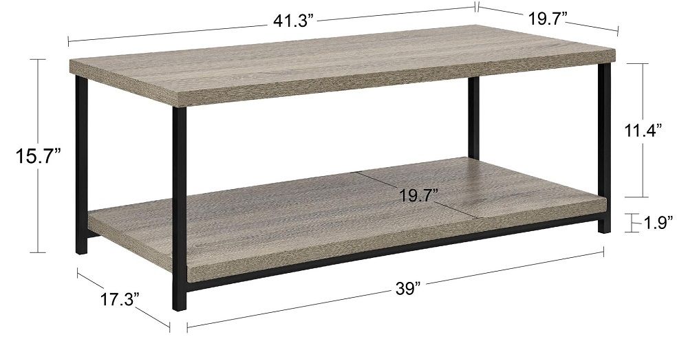 The simple, yet elegant design of the Ameriwood Home Elmwood Coffee Table makes it the center piece of your living room. This Coffee Table is the perfect spot for showcasing your decorative items or keeping all your magazines and remotes in one place. The 2 large shelves look beautiful and provide plenty of storage space. Made of laminated hollow core with a powder-coated metal frame, the textured weathered oak finish and black metal legs bring an instant upgrade to any space. The Coffee Table ships flat to your door and requires assembly upon opening. Two adults are recommended to assemble. Features The Ameriwood Home Elmwood Coffee Table brings style and functionality together Made of laminated hollow core shelves with powder-coated metal legs, the light oak woodgrain finish pairs with the black metal legs for a modern, yet classic look The top shelf of the Coffee Table is perfect for displaying decorative accessories or for keeping your remotes in one spot. Use the bottom shelf to organize books and magazines Complete your space with the entire Elmwood collection for a coordinated look (each sold separately) Â