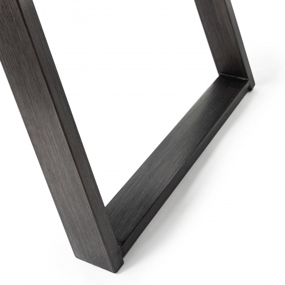Beauty and refinement are demonstrated in the design of the Hirst six-seater table. Sat upon a grey oak effect frame, the grey painted tempered glass top has a contemporary aesthetic that makes it a stylish and original addition to any dining room. With slanting ?U? framed rectangular metal legs, finished with grey hand brushing on a black powder coated base, the Hirst is inherently clean-lined and modern.
