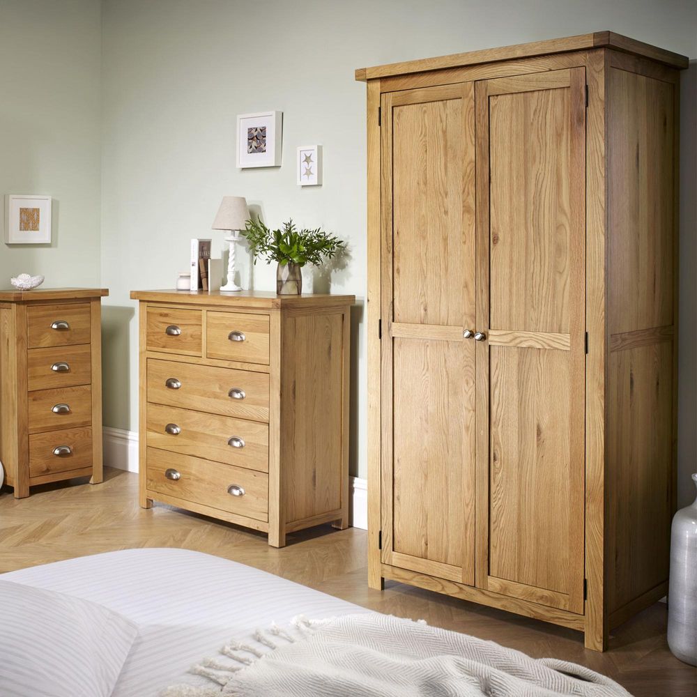 This Chunky solid oak range highlights the prominent grain of the wood creating a rustic feel. Providing cup style handles creating versatility within its style the Woburn range is suitable for a wide range of interior schemes. This 2 door wardrobe is spacious behind double doors featuring a single rail ideal for organising clothing.Why not re style your bedroom today! Solid Solid Oak construction ensures lasting durability and natural character Rustic finish delivering a premium, long-lasting surface appearance Generous 185cm height providing ample full-length hanging space inside Simple flat-pack assembly with all fixings and illustrated instructions included Features 1 hanging rail – providing ample hanging space for clothes, coats and suits Spacious interior with adjustable shelving for a fully personalised layout