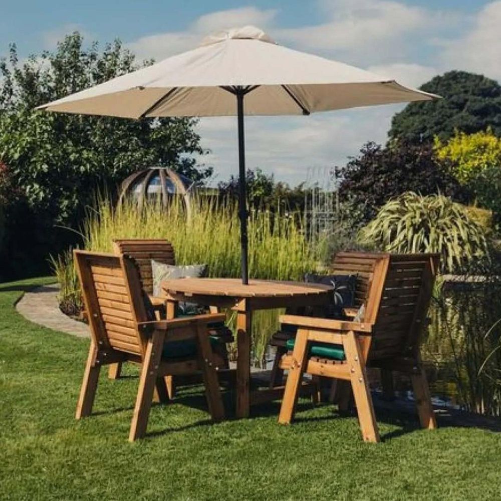 Wooden high quality brown patio set handmade in North Staffordshire. Get the best British made garden products from Churnet Valley Garden Furniture where we make quality wooden garden products using the finest Scandinavian Redwood which is pre-treated. Product Facts: Screwed and boltedHand crafted in the UKSwedish RedwoodPre-treated timberSeats up to 4 Specifications: Total footprint 220 cm x 220 cmTable diameter 113cmTable height 75cmChair seat width 50 cmChair seat height 43 cm Total height 95cm
