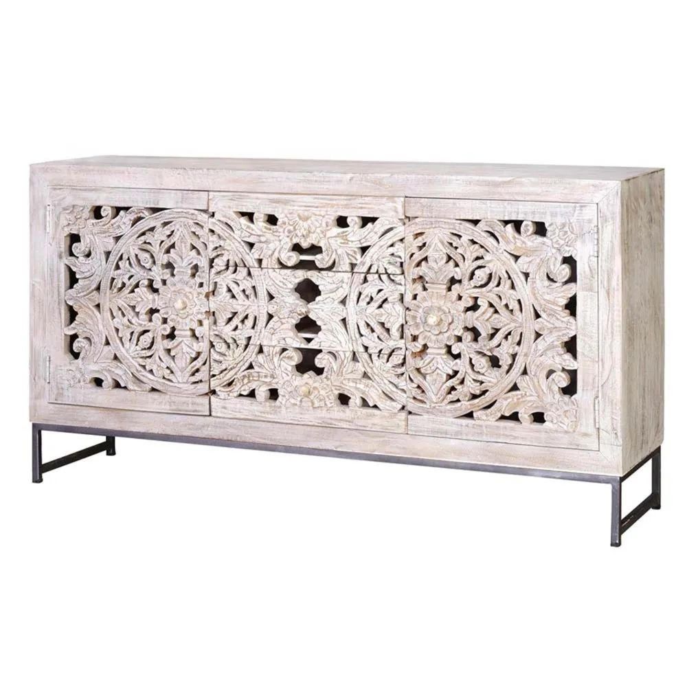 Clearance Item – available on a first-come, first-served basis while stocks last. Orders .This item is listed as clearance and available on first come first serve basis once ordered can not be cancelled. Hand Carved Mango Tree Wood Sideboard With Metal Legs. 2 doors with concealed adjustable shelving inside Smooth-gliding runners and quality concealed hinges throughout Generous surface space for display items, lamps and everyday décor Durable finish resistant to everyday knocks and scratches Coordinates beautifully with matching dining and occasional furniture