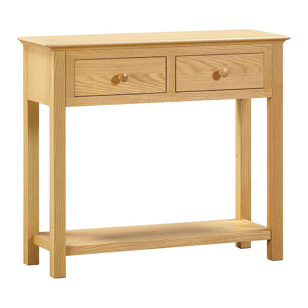 The Arlington Oak 2 Drawer Console Table is a timeless piece that blends classic craftsmanship with modern practicality. Designed as part of the much-admired Arlington Oak Range, this console table offers both style and substance, making it a versatile addition to hallways, living rooms, or dining areas. Crafted from a combination of solid oak, oak veneer, rubberwood, pine, and MDF, this piece showcases the natural beauty of wood while ensuring long-lasting durability. Its natural oak finish is protected with a light lacquer, giving the surface a clean, smooth appearance that enhances the grain and character of the wood. The table features two spacious, dovetailed drawers with round wooden knobs, perfect for keeping everyday items neatly tucked away. A moulded top adds subtle detailing, highlighting the skilled workmanship behind its design. Elegant and understated, this console table complements both traditional and contemporary interiors. Key Features: Part of the Arlington Oak Range – designed for bedroom, dining, and living spaces Crafted from solid oak, oak veneer, rubberwood, pine, and MDF for strength and stability Finished in a natural oak lacquer for a clean, modern appearance Two dovetailed drawers for secure storage with traditional craftsmanship Round wooden knobs for a refined, classic touch Moulded top design for added elegance Functional and stylish – perfect for everyday use and special occasions Delivery & Returns: and assembly on all orders across the UK Convenient time slot confirmation so you know when to expect your order Delivered with care using our own vans and an experienced delivery team The Arlington Oak 2 Drawer Console Table is more than just a practical storage solution – it’s a statement of quality and craftsmanship. Its natural wooden finish, timeless design, and careful detailing make it an investment piece you’ll enjoy for years. Choose this console table today and bring home the perfect balance of beauty, function, and enduring craftsmanship.