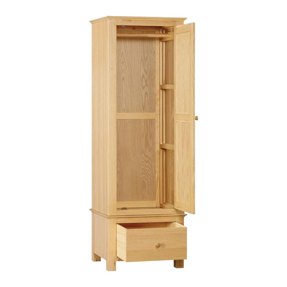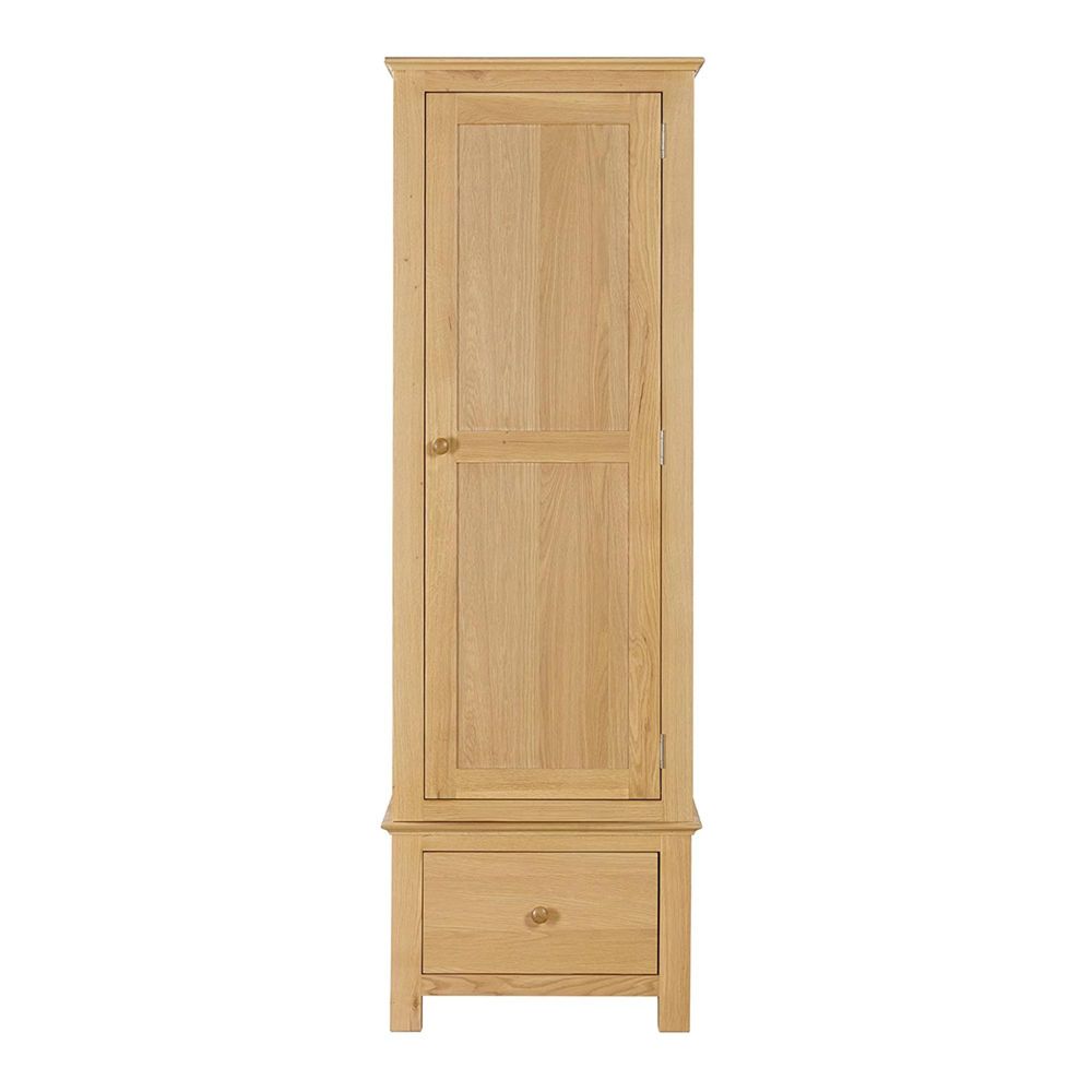 The Arlington Oak 1 Door Single Wardrobe is a beautifully crafted piece from the highly regarded Arlington Oak Range. Designed with a timeless appeal, this wardrobe combines functionality with elegant design, making it a practical storage solution for smaller spaces or as an additional piece within a complete bedroom set. Crafted using a mix of solid oak, oak veneers, rubberwood, pine, and MDF, the wardrobe is finished in a natural oak tone and sealed with a light protective lacquer. This enhances the beauty of the wood grain while providing durability for everyday use. The wardrobe features a moulded top for subtle detail, a dovetailed drawer for strength and longevity, and a traditional round wooden knob to complete the look. Its compact size ensures it fits comfortably into smaller bedrooms, guest rooms, or even hallways, while still offering ample hanging space for clothing. The natural oak finish lends a warm, welcoming feel, making it a versatile addition to both modern and traditional interiors. Key Features: Made with solid oak and quality oak veneers for long-lasting strength. Finished in a natural oak lacquer that highlights the wood’s grain while protecting the surface. Compact 1-door design, ideal for smaller bedrooms or as supplementary storage. Includes a dovetailed drawer for added durability and storage flexibility. Designed with a moulded top and round wooden knob, showcasing traditional craftsmanship. Part of the wider Arlington Oak Range, allowing you to create a coordinated look across your home. Delivery & Returns: and assembly on all orders across the UK Flexible delivery slots with time slot confirmation for your convenience. Delivered safely using our own vans and experienced two-person delivery teams. Hassle-free returns policy if you’re not completely satisfied. This wardrobe isn’t just a storage unit—it’s a piece of finely made oak furniture that balances practicality with timeless charm. With its solid oak construction, thoughtful design, and compact structure, it’s the perfect choice for those who value both beauty and function in their home. Bring home the natural warmth of wooden furniture with the Arlington Oak 1 Door Single Wardrobe and enjoy a piece that will remain stylish and dependable for years to come.