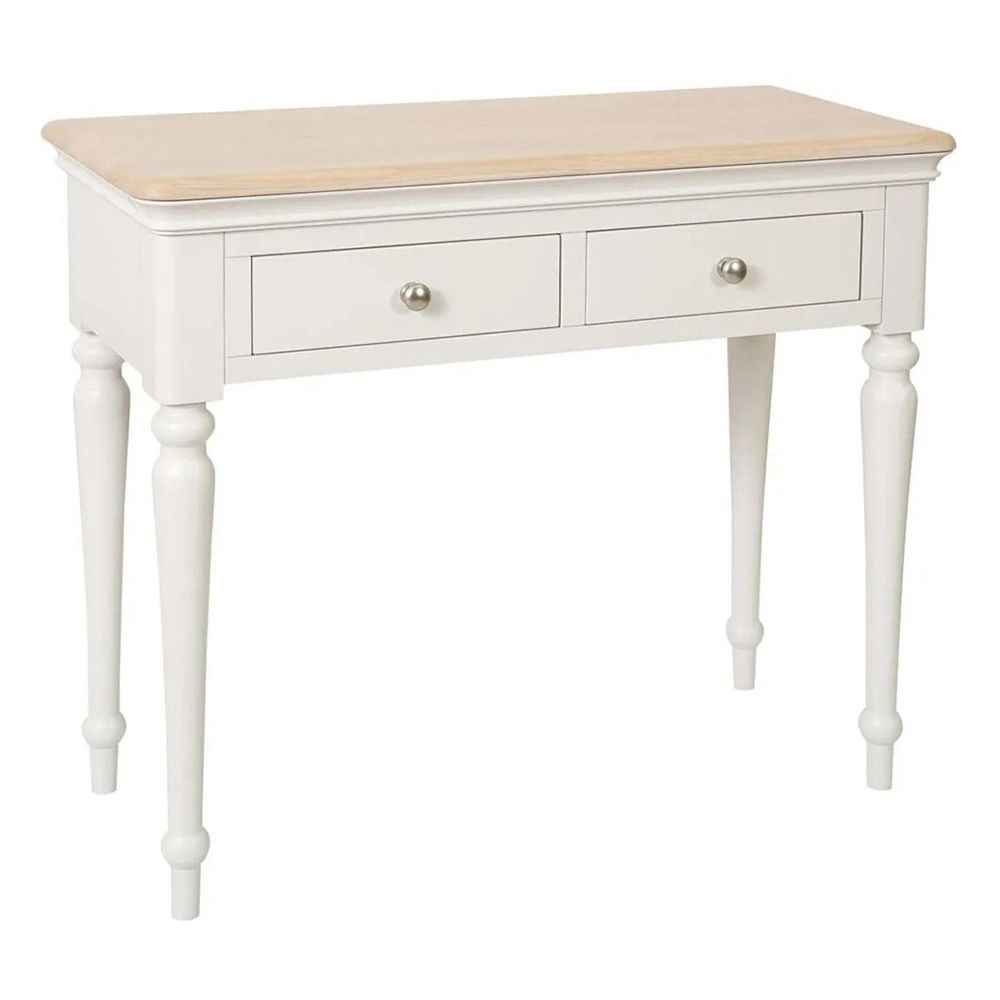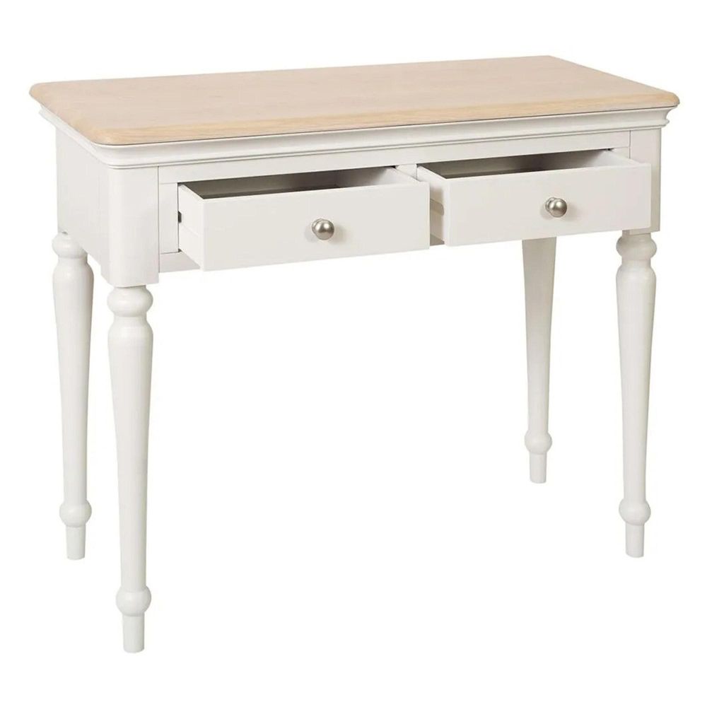The Cromwell Grey Painted 2 Drawer Dressing Table is a beautifully crafted piece that brings both elegance and practicality to your bedroom. With its slim profile and two spacious drawers, it provides the perfect balance of storage and style, making it ideal for everyday use. Finished in a soft light grey paint and topped with lightly lacquered solid oak, the dressing table blends modern minimalism with timeless charm. The drawers are fitted with sleek metal knobs, while the turned legs add a touch of traditional character, reflecting the thoughtful craftsmanship found throughout the Cromwell collection. Designed for versatility, this table works just as well as a stylish desk or console, ensuring it remains a long-lasting and functional part of your home. Pair it with the matching Cromwell padded dressing stool to complete the set. Key Features: Two spacious drawers for cosmetics, accessories, or stationery Light grey painted body with a lightly lacquered solid oak top Metal knobs for a refined finish Turned legs for added character and stability Constructed from a high-quality blend of oak, pine, and MDF Neutral, light-toned finish suitable for a wide range of interiors Can be paired with the Cromwell padded stool in light grey fabric Also available in a white painted finish Delivery & Returns: Free mainland UK delivery Convenient time slot confirmation Delivered carefully by our own vans and experienced team Hassle-free returns for added peace of mind Functional yet elegant, this dressing table offers the perfect space for your morning routine, while its timeless design ensures it blends seamlessly into modern or traditional bedrooms. Built with durability and refined style, it’s a versatile investment that you’ll enjoy for years. Bring home the Cromwell Grey Painted 2 Drawer Dressing Table today and add a touch of craftsmanship, beauty, and functionality to your space.