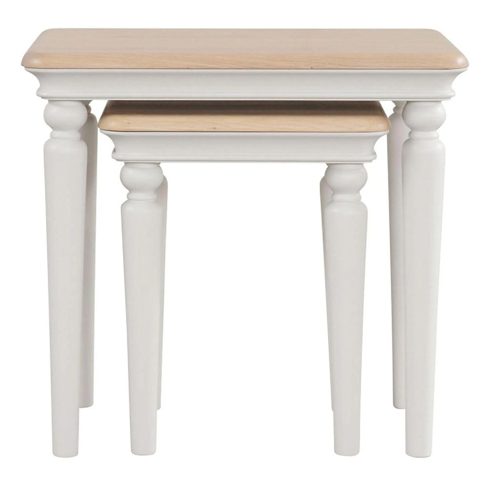 Beautifully crafted with turned legs, a painted finish, and solid oak tops, this nest of two tables brings versatility and charm to your living area. Use them together or apart perfect for entertaining, serving drinks, or creating extra surface space whenever you need it, then neatly nest them away. Key Features: Crafted from White Oak, pine and MDF. A beautifully refined design featuring delicate curves, turned legs, rounded solid oak tops, and elegantly moulded cornices and plinths. Designed in the UK. Finished in a smooth durable Grey Mist paint, with lightly lacquered solid oak tops. Delivery & Returns: Free mainland UK delivery Time slot confirmation for added convenience Delivered using our own vans and specialist team