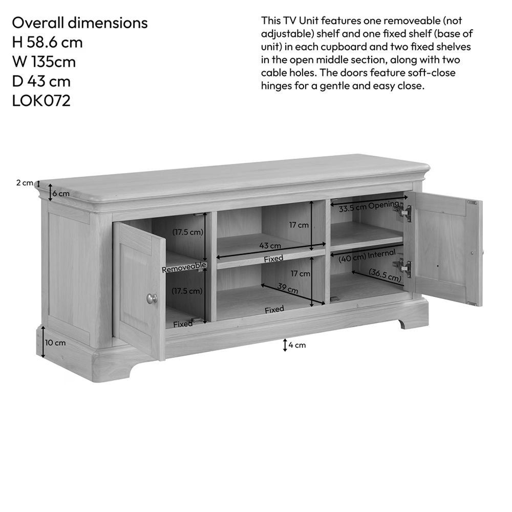 This spacious oak TV unit combines elegant style with practical features. With soft curves, a solid oak top, and a fresh smooth finish, it offers two roomy cupboards for hidden storage and an open middle section for your devices ideal for modern family homes with a country twist.Crafted from White Oak, pine and MDFAvailable in all-over pale oak with a protective lacquer or a choice of 2 durable paint colours - Grey Mist or White with Oak top contrast (see Lydford Collection)A graceful design with beautiful delicate curves and rounded solid oak topsDelivery & Service Highlights: across England and WalesPre-confirmed delivery slots for added convenienceHandled by our professional delivery teamHassle-free returns for complete peace of mind