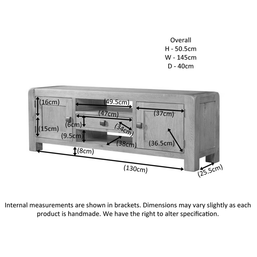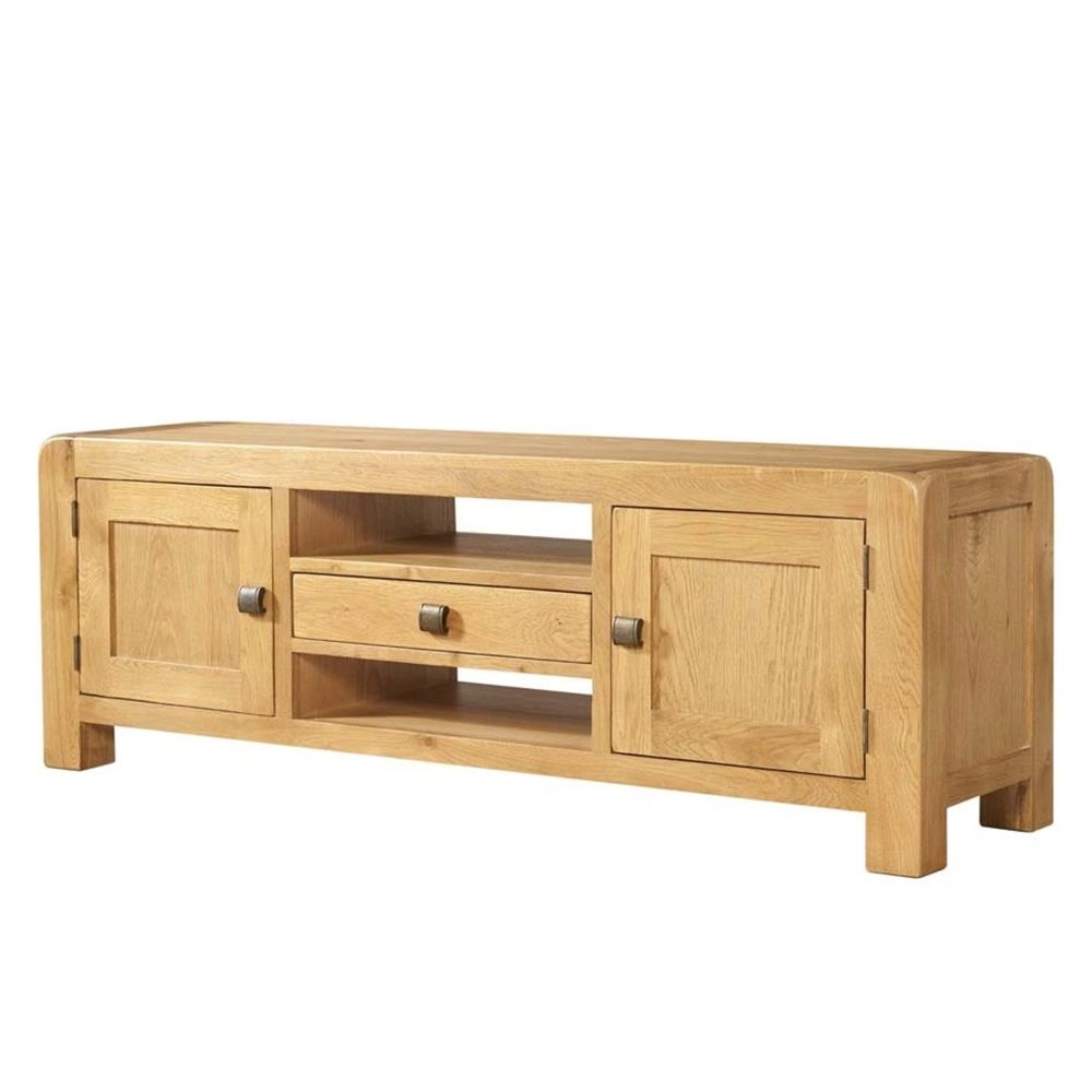 Crafted from solid oak with a natural waxed finish, the Curve Oak 145cm Wide TV Unit combines timeless style with practical design. Its smooth curved edges and fine detailing reflect expert craftsmanship, making it a standout piece of oak furniture for the modern living room. The wide design provides ample storage and display space, making it as functional as it is refined. With open shelving, a central dovetailed drawer, and side cupboards, this TV unit is ideal for keeping media essentials organised while maintaining a clean, uncluttered look. Key Features: Premium Solid Oak – Built from durable solid oak, ensuring long-lasting strength and beauty Waxed Finish – Enhances the natural grain of the wood for a warm, refined look Wide Structure – Comfortably accommodates larger televisions up to 65 inches Central Dovetailed Drawer – Sturdy craftsmanship with classic rustic metal knob detailing Open Shelving – Two spacious open shelves for media players, consoles, or decorative pieces Twin Cupboards – Discreet side storage for DVDs, accessories, and household items Ready Assembled – Delivered fully built for immediate use Delivery & Returns: – No hidden costs Flexible Scheduling – Time slot confirmation so you know exactly when to expect your order In-House Delivery Team – Furniture is handled with care by our own vans and drivers Easy Returns – Simple process if you change your mind Bring together style, strength, and practicality with the Curve Oak 145cm Wide TV Unit. Its thoughtful design and enduring quality make it a centrepiece you’ll enjoy for years to come. Order today and experience the lasting craftsmanship of solid oak furniture in your home.