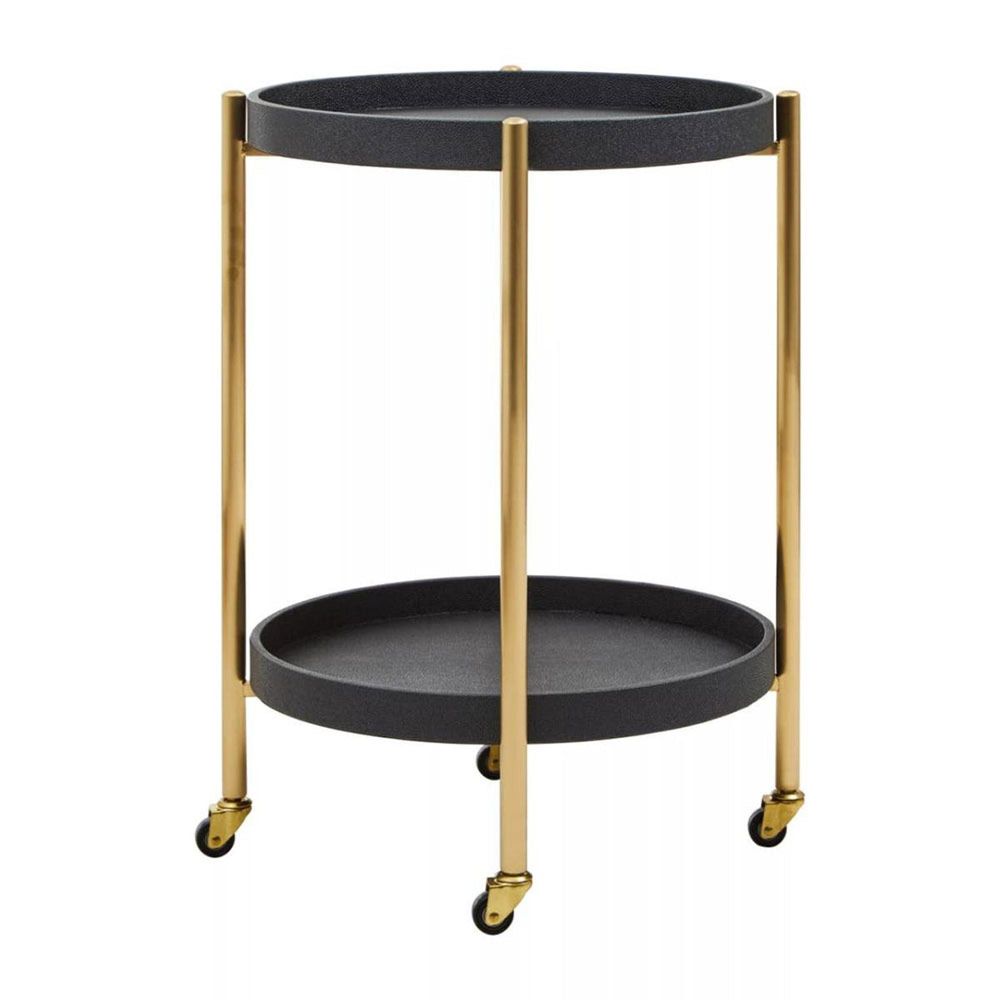 The Cardoba two tier tray table trolley is a luxe addition to any decor thanks to its sculptural frame in a brushed matte gold finish. This two tier tray table trolley has a minimal frame in a brushed matte gold finish with black faux shagreen tiers. The circular shelves with raised sides combine with the sleek frame to create a luxurious aesthetic.Black colour shagreen tops Gold finish legs Luxe appearance Two tier trolley With castors wheelsDelivery & Service Highlights: across England and WalesPre-confirmed delivery slots for added convenienceHandled by our professional delivery teamHassle-free returns for complete peace of mind