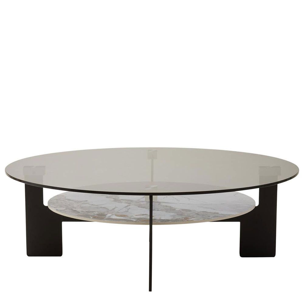This round coffee table combines a grey glass top with a white ceramic lower shelf, supported by elegant black coated iron legs for a modern look.The Imperia large round coffee table features a sleek grey glass top and a lower shelf with a ceramic marble effect, offering a modern and elegant contrast. The entire structure is gracefully supported by four distinctive black metal legs that provide stability and a bold, architectural flair.White ceramic lower shelf Black finish metal legs Grey glass top Marble effect Contemporary statement pieceDelivery & Service Highlights: across England and WalesPre-confirmed delivery slots for added convenienceHandled by our professional delivery teamHassle-free returns for complete peace of mind