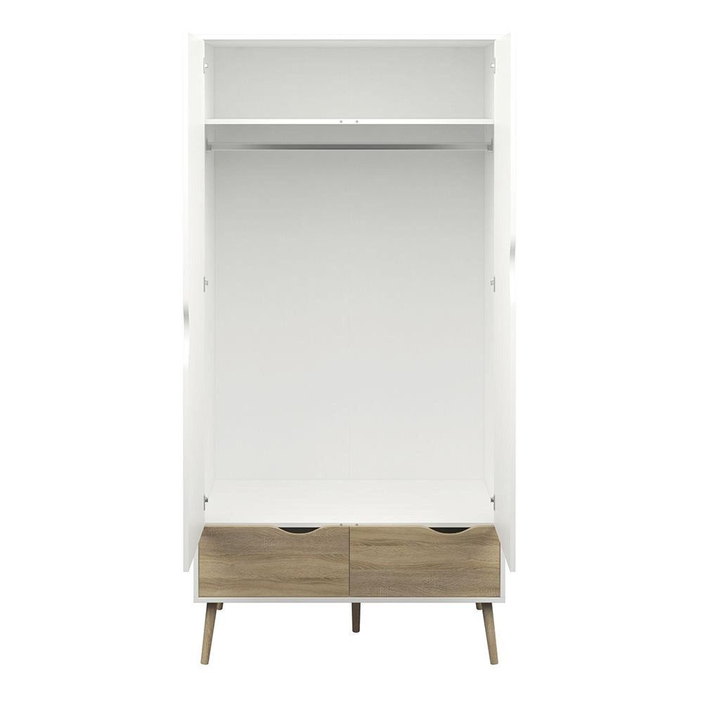 Oslo Wardrobe 2 Doors 2 Drawers in White and Oak. Alluding a retro modern charm, the Oslo collection has an authentic scandinavian appeal with real style. Stylish and trendyHigh quality laminated board (resistant to damage and scratches, moisture and high temperature)Easy gliding drawer runnersAdjustable hinges on all doorsAnti- tip safety and safety wall fitting