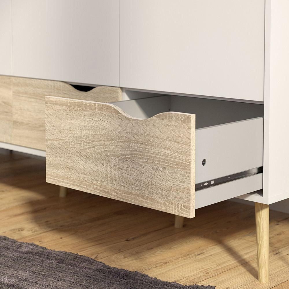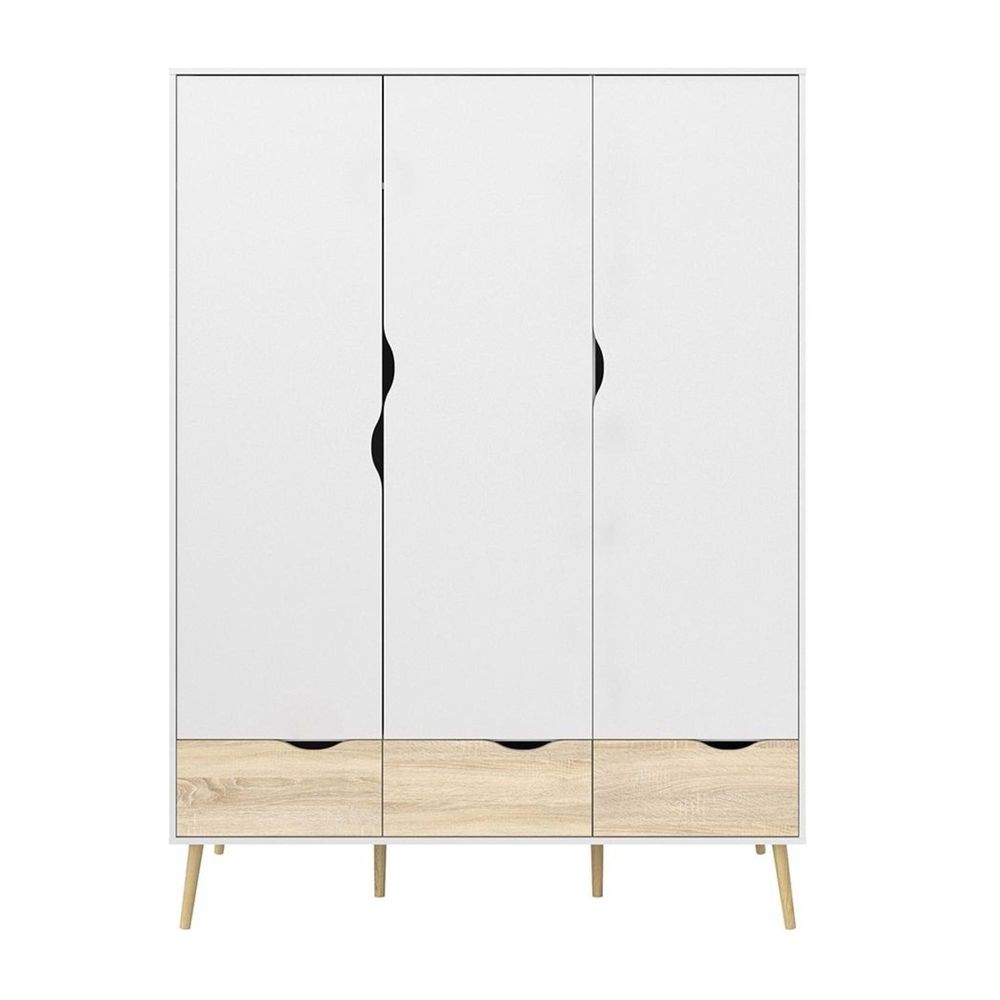 Oslo Wardrobe - 3 Doors 3 Drawers in White and Oak. Alluding a retro modern charm, the Oslo collection has an authentic scandinavian appeal with real style. Stylish and trendyHigh quality laminated board (resistant to damage and scratches, moisture and high temperature)Easy gliding drawer runnersAdjustable hinges on all doorsAnti- tip safety and safety wall fitting