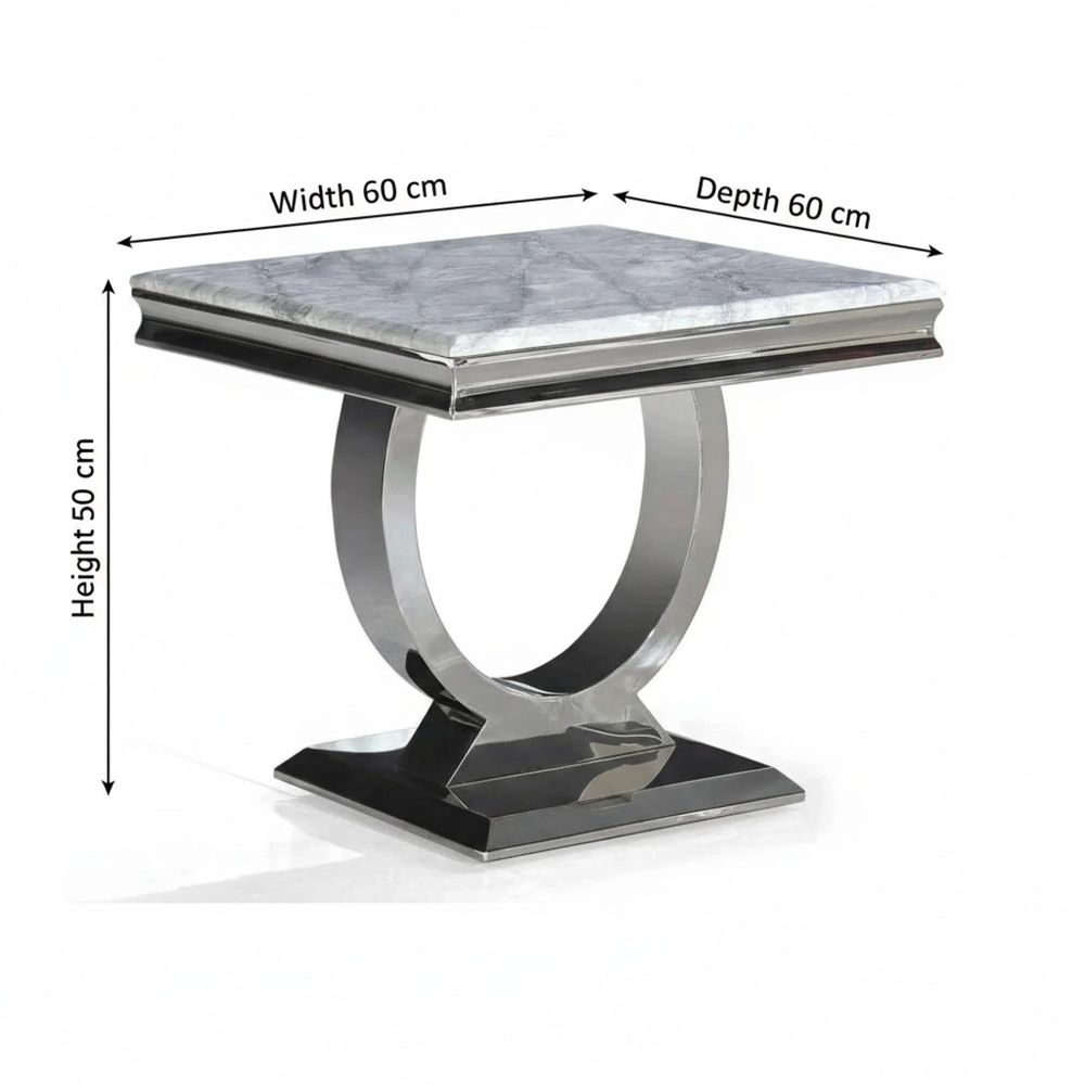 Compact in form, grand in impact, the Glacier Grey Marble and Chrome Side Table is a statement piece in its own right. Designed with a square grey marble top and a polished chrome base, it blends luxurious textures with a minimalist silhouette. Whether placed beside a sofa or used as a display table, it adds instant refinement to any space. This side table complements the entire Glacier Range, offering versatility and visual harmony throughout your home. Key Features Square grey marble top with high-gloss finish. Sturdy chrome circular pedestal base. Ideal for use as an accent or end table. Matches seamlessly with other Glacier Range pieces including the dining table, coffee and console tables. Compact and functional for modern living. Convenient and reliable returns process. Refine your corners. Complete your space with Glacier.