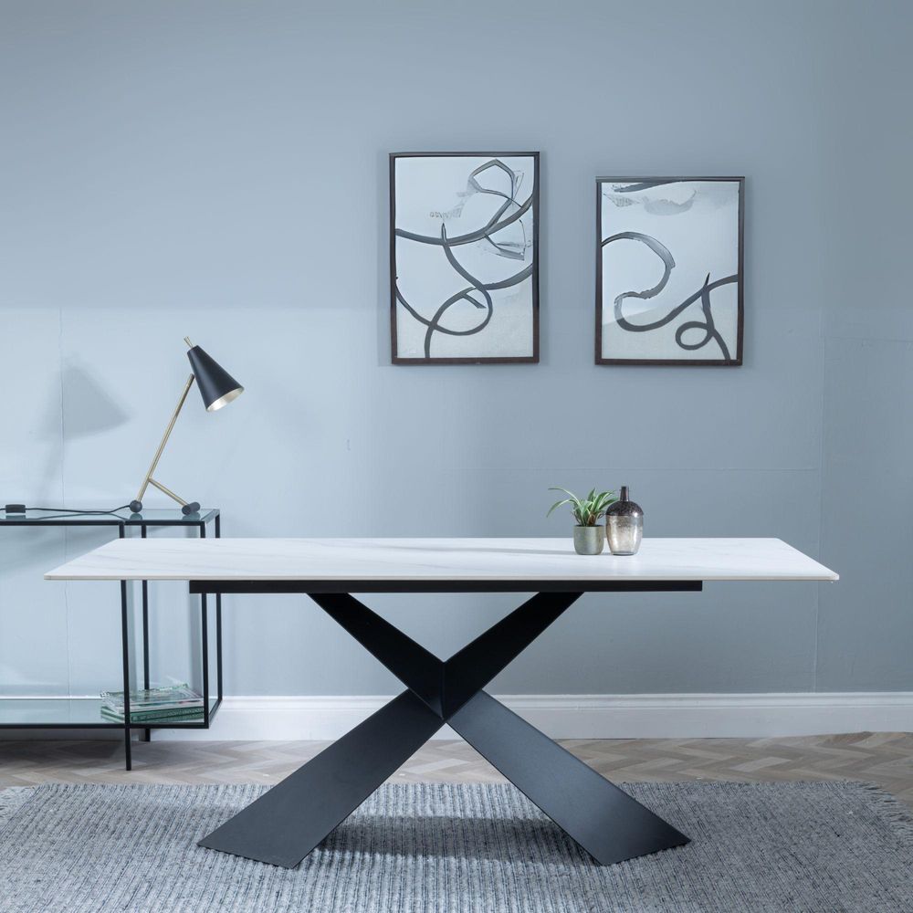 The Merlin Dining Set - 6 Seater - 180cm - White Ceramic - Peyton Dining Chairs - Grey Fabric - crafted from Ceramic with Metal legs, finished in White and Grey, available in White and Black, Contemporary style, Rectangle shape. Free UK standard delivery included.