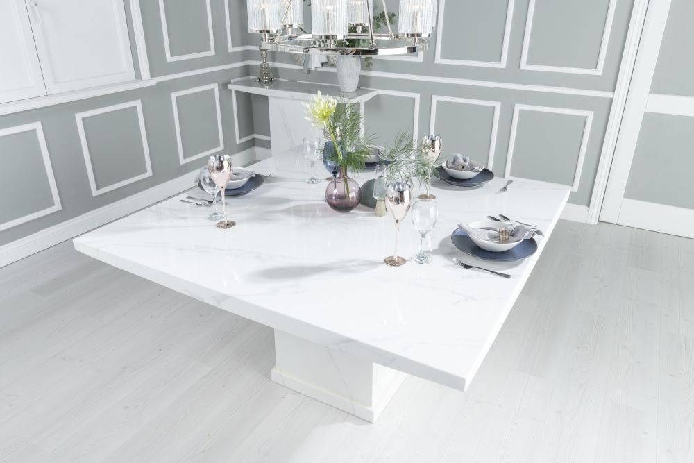 The Turin Dining Set - 8 Seater - 140cm - Square - White Marble - Knocker Back Dining Chairs - Grey Fabric - Chrome Legs - crafted from Engineered Marble with Marble legs, finished in White and Grey, available in White, Modern style, Square shape. Free UK standard delivery included.