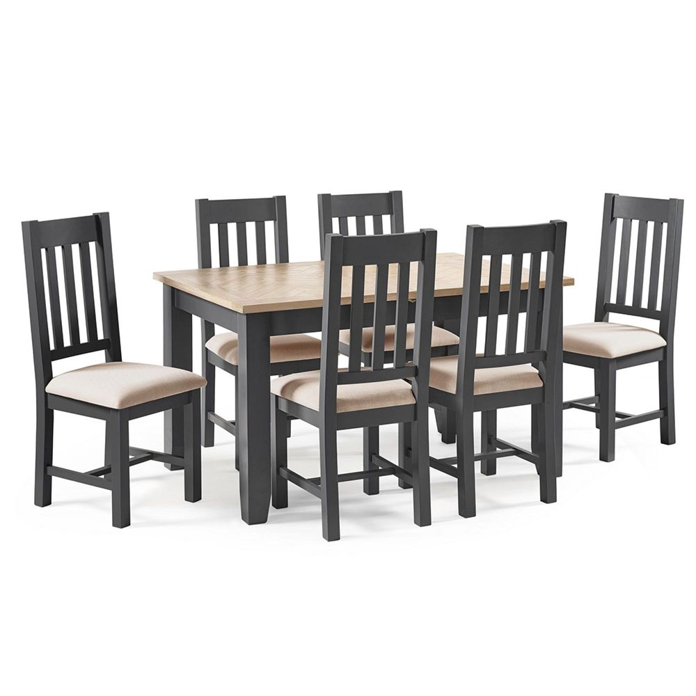 Designed exquisitely, the Bordeaux Dining Set is finished in a beautiful grey shade that will complement various existing decor styles. The parquet tops detailing leaves an elegant and rustic feel the perfect way to make your house feel like a home. This classic dining table features a 40cm butterfly extension system that is easy to use and stores within the table when not in use. Solid Solid Oak with Real Oak Veneers construction ensures lasting durability and natural character Dark Grey Lacquer finish that enhances the natural wood grain and protects against everyday wear 180cm wide surface giving everyone plenty of comfortable dining space Simple flat-pack assembly with all fixings and illustrated instructions included Butterfly extending mechanism stores neatly inside – no separate leaf to lose Heat, stain and scratch resistant surface for everyday family use