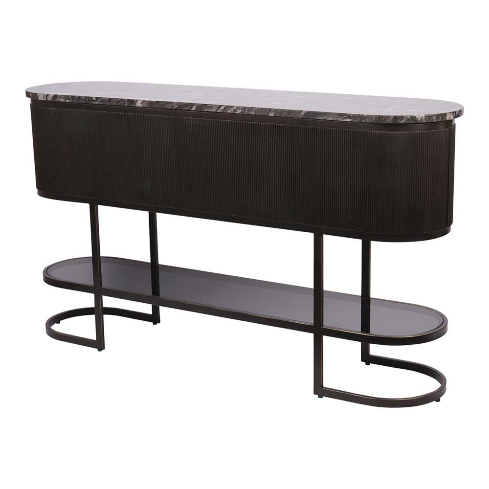 The Belvedere Console Table - Black Marble - Oval - crafted from Glass and Iron with Iron legs, finished in Gilded Dark Bronze, available in Black, Contemporary style, Oval shape. Free UK standard delivery included.