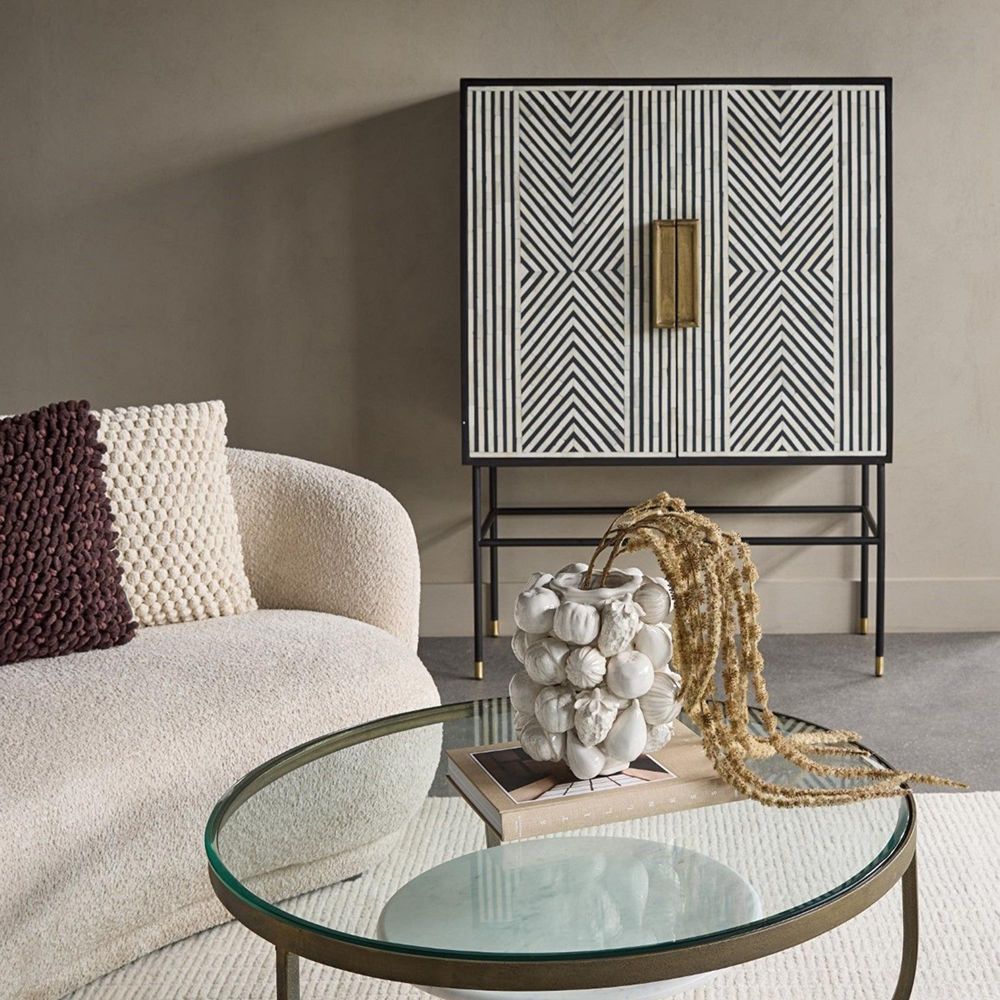 The Delaney Bar Cabinet - Black and White Bone Inlay - 2 Door - crafted from Bone, Mdf and Metal, finished in Black and White, Farmhouse style. Free UK standard delivery included.