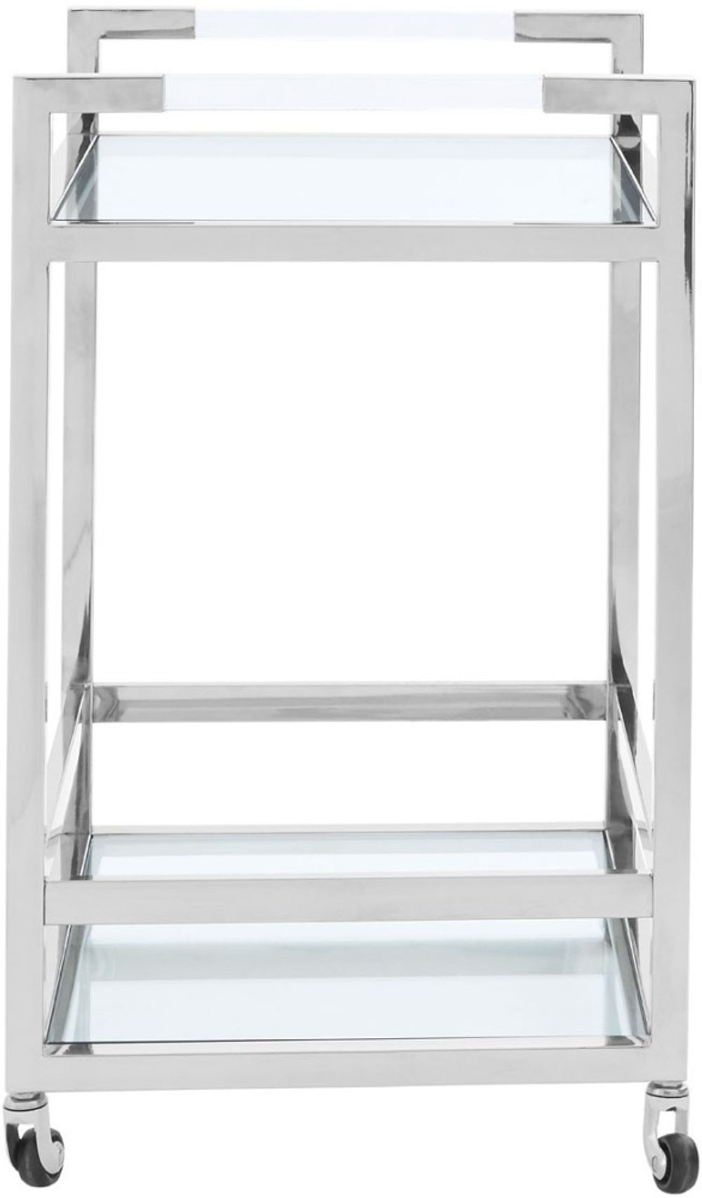 This highly reflective butler trolley makes an opulent addition to the home bar area.The frame of the Vogue butler trolley is made from polished stainless steel, with a bar surrounding its bottom section to ensure bottles stay in place when the trolley is being pushed. Both of its tiers are made from a single pane of clear tempered glass. A segment of clear acrylic is integrated into the trolley's handles.Luxe design.Polished stainless steel.2 tiers.Clear tempered glass.