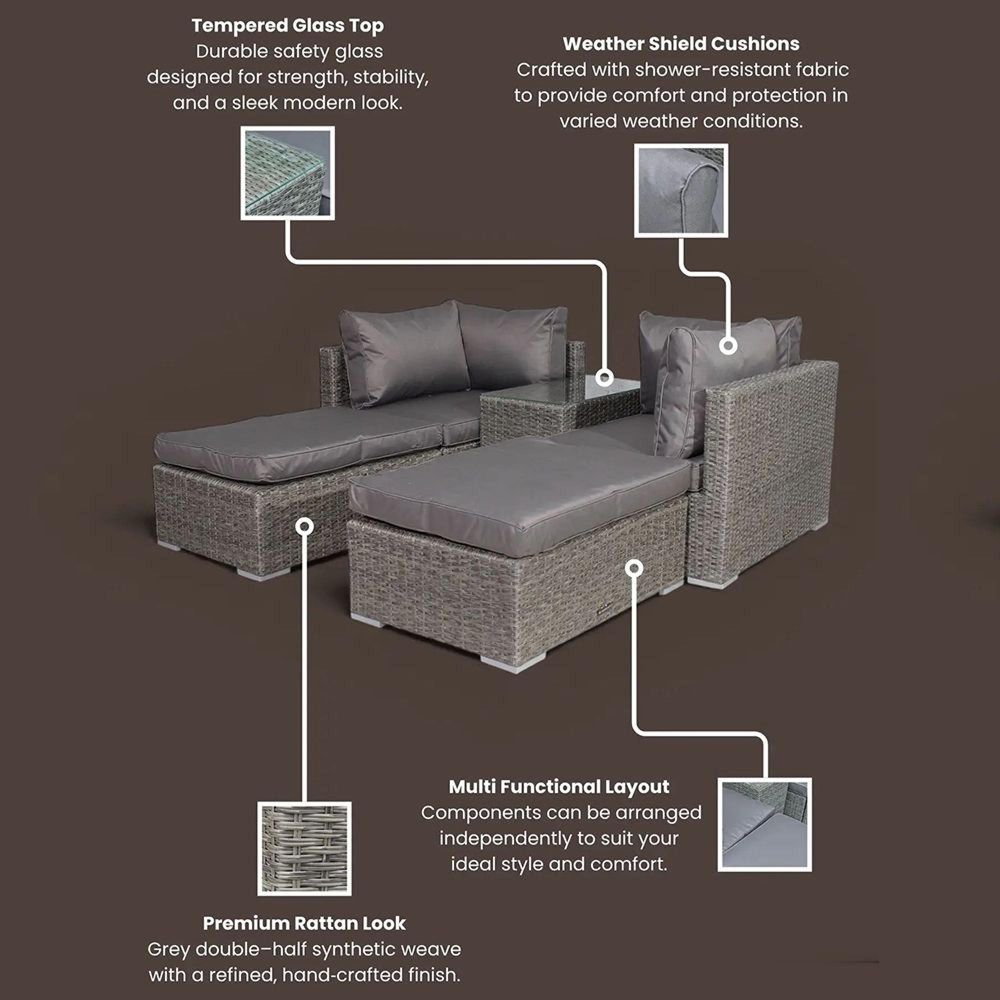 Paris Multi Relaxer Set Transform your outdoor space into a serene retreat with the Paris 4-Seater Multi-Setting Relaxer Set. Ideal for lounging in your garden during the summer months, this versatile set offers customizable seating options, allowing you to create your own perfect formation for relaxation or entertainment.Material: Double half-round Synthetic Rattan.Cushion Colour: Grey.Modern and .Aluminium frame.Weather Shield Cushions Included.Perfect for any garden.Multi seating options.The set includes:1 x RH & LH Chair.2 x Footstools.1 x Side table.RattanThe specification of rattan furniture is made to withstand the weather conditions in the UK, however, should be protected further in adverse and extreme weather conditions (using a high quality furniture cover). Your rattan will contract and expand based on the weather conditions. In warm weather, our rattan will expand and then contract back to its original state once temperatures become cooler. This is a completely normal trait for rattan garden furniture and in result will stop the weave from snapping and becoming brittle in the winter months. Please avoid leaving reflective objects on your table in direct sunlight (glasses, bottles, ornaments) as this may lead to your rattan damaging in the sun.CushionsWe strongly recommend to store your cushions in a dry place when not in use and through Autumn and Winter months. During a rain shower the Weather Shield fabric allows the water to bead on the surface which you can simply shake off. During heavy or persistent rain, water may ingress slightly through the sewing seams. Simply unzip the cover, remove the filling shaking out any water drops, before reinserting the filling into the cover for continued use. Drying time will vary depending on local weather conditions.Flexible Seating Options:This set includes 2 corner chairs, 2 stools, and a table, providing various configurations to suit your lounging needs, whether you're hosting friends or enjoying a quiet moment alone.Stylish and Durable Design:Crafted from slate grey double half-round wicker hand-woven onto a robust aluminium frame, this set combines aesthetic appeal with long-lasting durability, making it suitable for both indoor and outdoor use.Weather Shield Cushions:Enjoy comfort without worry? our cushions are both stain-resistant and water-resistant, designed to withstand the elements while providing a cozy seating experience.Please note: Colours may very slightly from those shown. Variations can occur due to the natural characteristics of materials (such as wood, fabric, or rattan), as well as differences in screen resolution and lighting when viewing images.